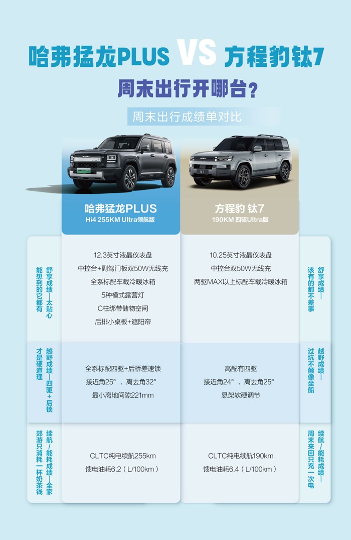 - 哈弗猛龙PLUS VS 方程豹钛7,周末出行开哪台?